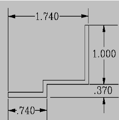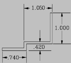 When developing flat length for 90 degree bends always make sure the dimensions are outside to outside . Using the example to the right let us say the material thickness is .050 and the bend radius is .032. Our bend allowance would be: (.0078 x .050 + .01743 x .032) x 90 = .085 Now we can calculate the bend deduction: 2 x (.050 + .032) = .164 .164 - .085 = .079 B.D. Look at the two pictures closely and notice the different way each is dimensioned. They are both identical parts. The first picture is shown dimensioned like a typical blueprint. The second is the dimensions we need for our flat pattern development. We got the bottom dimensions from the information on the first drawing. Note that the .370 dimension is located from outside of a bend to the inside of a bend. We will have to add a material thickness to the .370 dim. making it .420. The 1.050 dim. on the bottom picture came from subtracting .740 from 1.740 which would give us a distance of 1.000 from outside to inside. Now we have to add a material thickness to the 1.000 dim. making it 1.050 which now gives us all of our outside dimensions. We can do our development next. Below is an easy way of keeping track of our bends and bend deductions. You can count the B.D.'s and see that we are figuring for 3 bends. .740 -.079 B.D. .661 +.420 1.081 -.079 B.D. 1.002 +1.050 2.052 -.079 B.D. 1.973 +1.000 2.973 = Flat stretch out